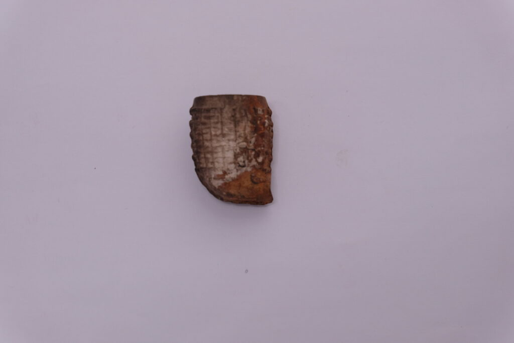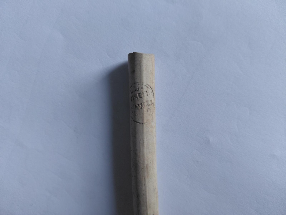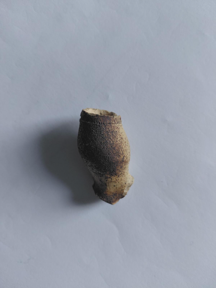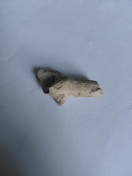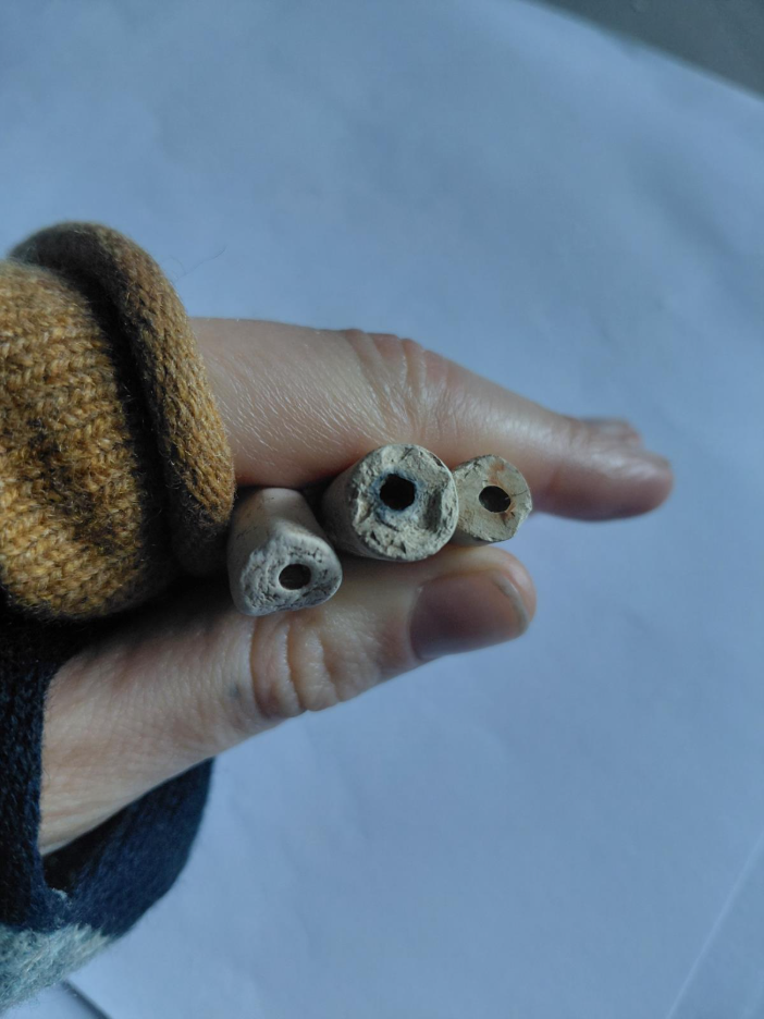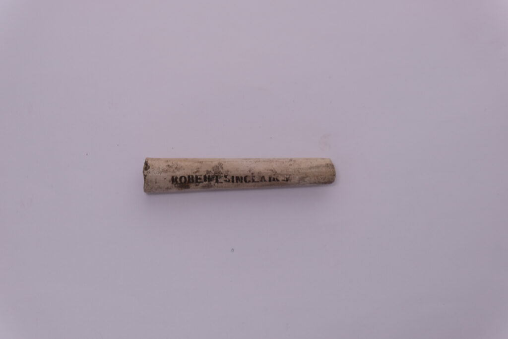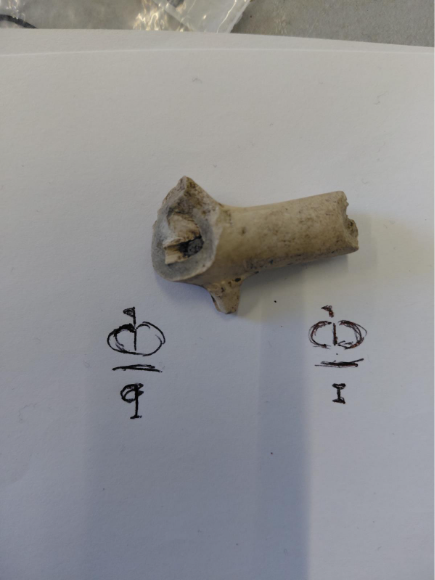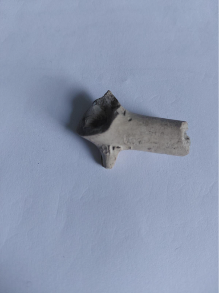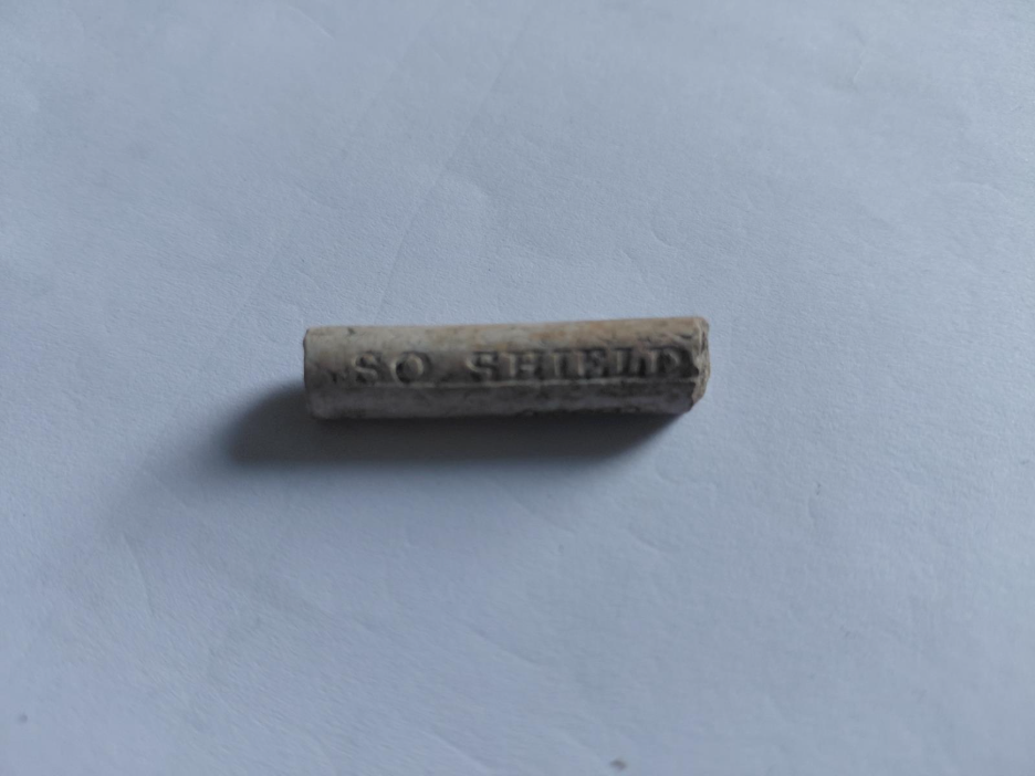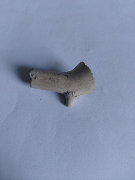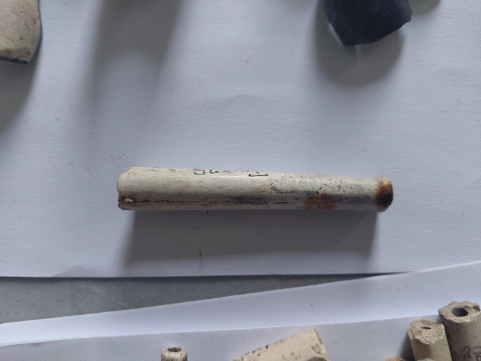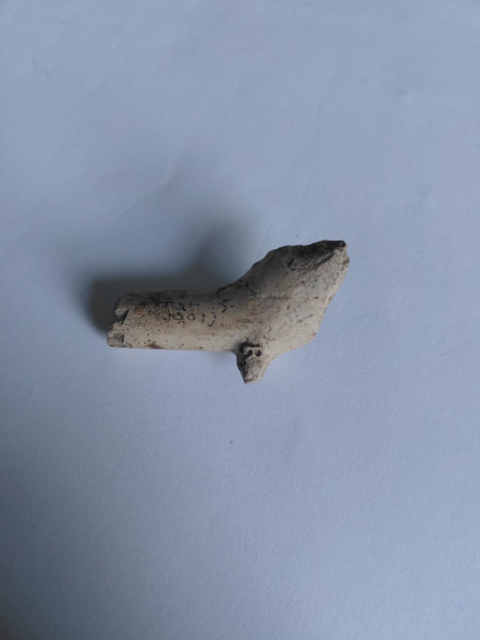Caption: a later clay pipe stem with a rounded or ‘nipple shaped’ mouthpiece.