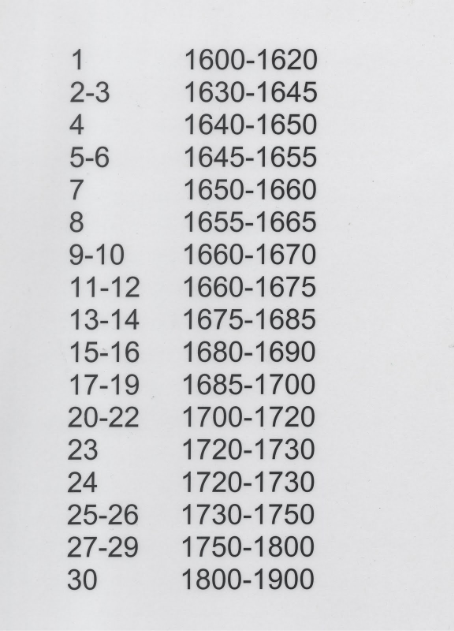 Working from the chronology above, we created four broad categories for the bowls; 1600-1665, 1665-1685, 1685-1730, 1730-1900. We decided on these dates as these are the points in which the designs of the pipes became sufficiently differentiable to split them into categories. Also, many of our pieces or broken or fragmentary, making it harder to be precise with dating. A true expert would also look at the size of the bore hole in the pipe, however this is measured is 64ths of an inch and honestly, without a pair of tiny calipers life is too short and our eyesight too precious.