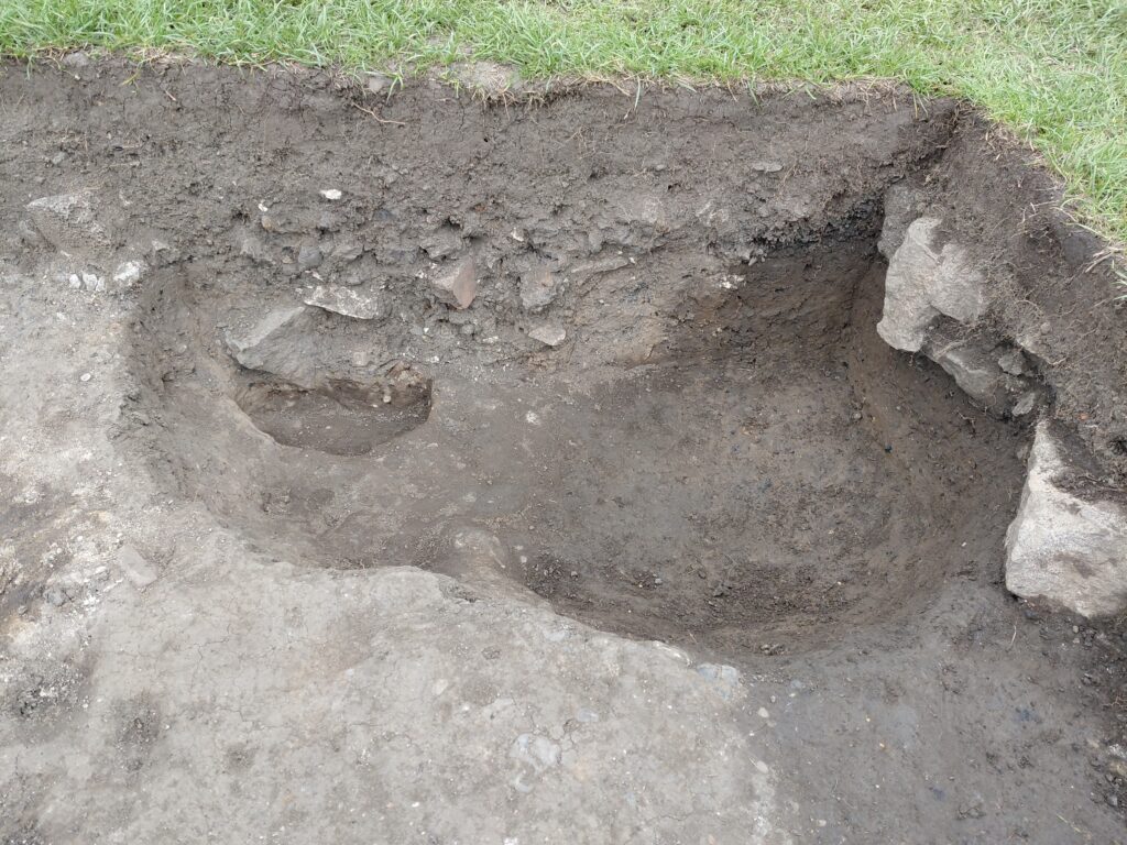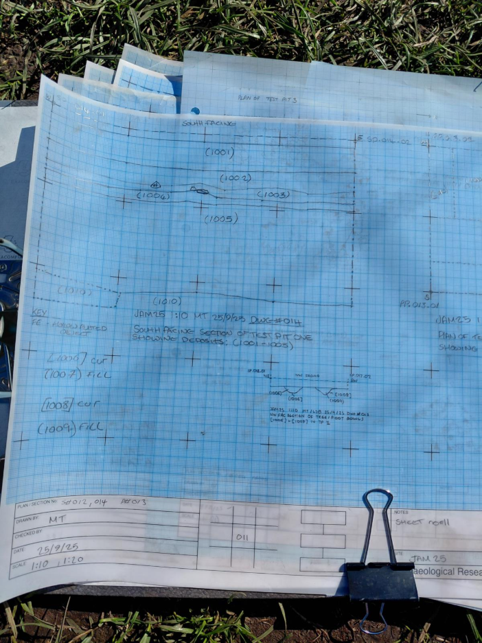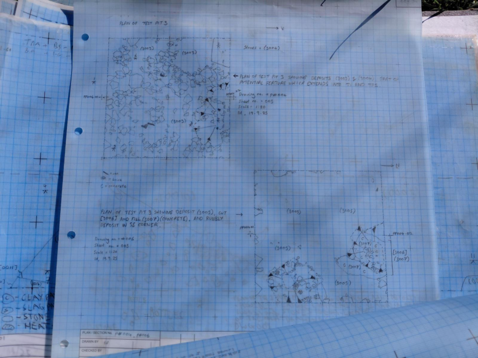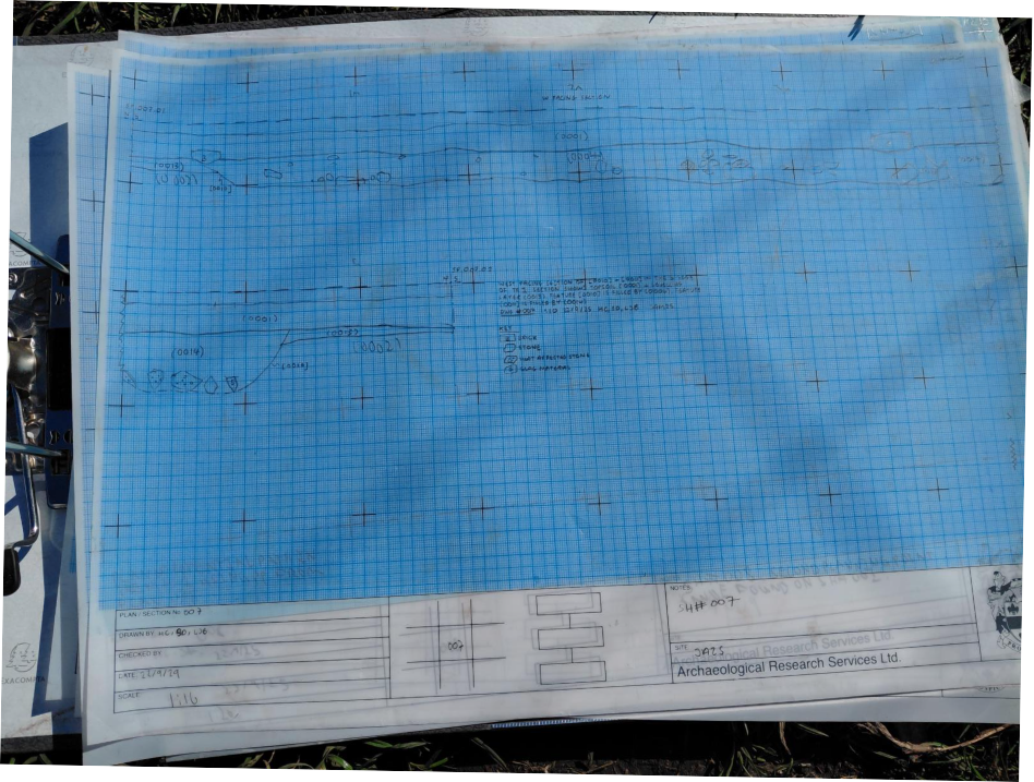 There are two types of archaeological drawings done in the field; sections and plans. A plan is a drawing of the trench, test pit or archaeological feature which is drawn from a birds-eye view. A section is a drawing of a vertical surface, like the edge of the trench for example, which records the different layers of soil, any potential human activity, and how these have built up over time, something also known as the stratigraphy. In the section drawing above we can see the cut of out strange stoney feature in Trench 1 and its relationship to the other deposits above and below it.