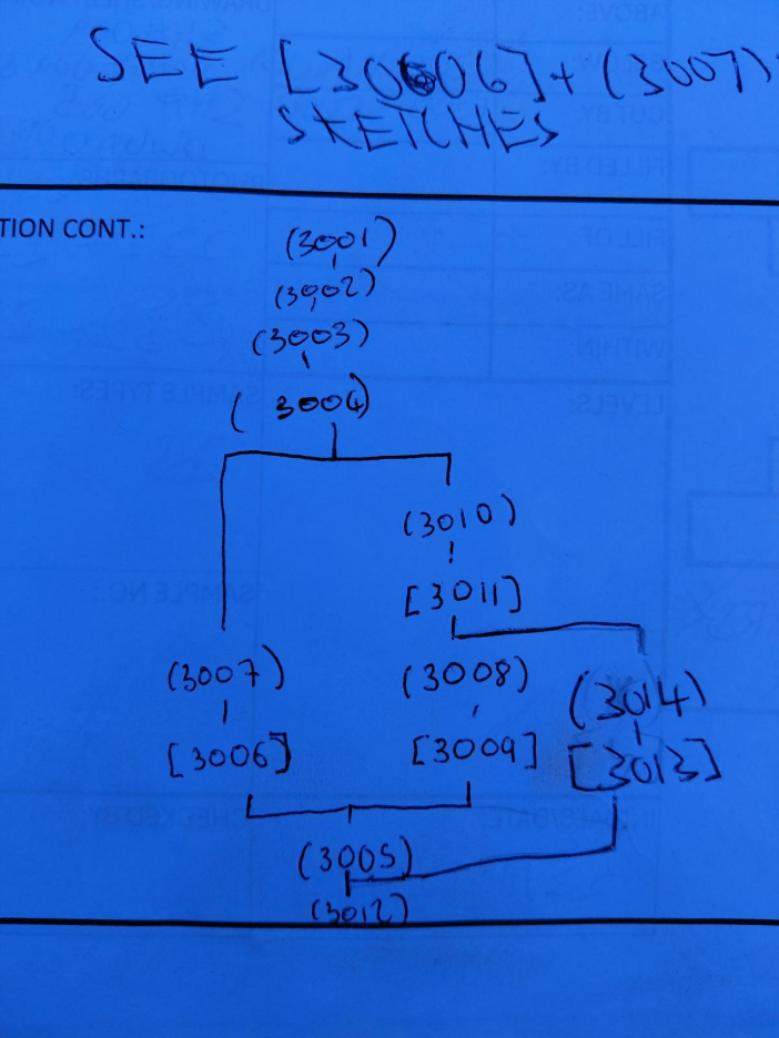 From this matrix an archaeologist can see that we have basal layer (3012) which is cut by a pit [3013] which contains fill (3014), it was then covered by deposit (3005), into which were then dug two features, probably at about the same time, but which don’t otherwise interact with each other; cut [3006] with fill (3007), and cut [3009] with fill (3008), but cut [3009] not only disturbed deposits (3005) and (3012), it also disturbed feature [3013], and both were then disturbed again by cut [3011] which contains fill (3010). They were then covered by deposits (3004), (3003), (3002) and (3001). Easy.