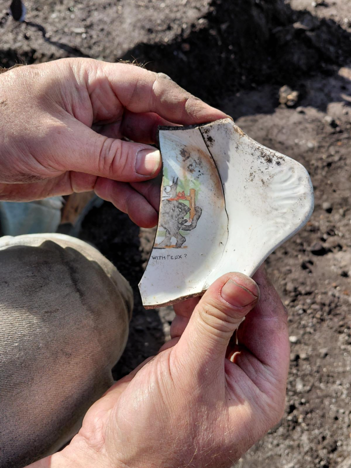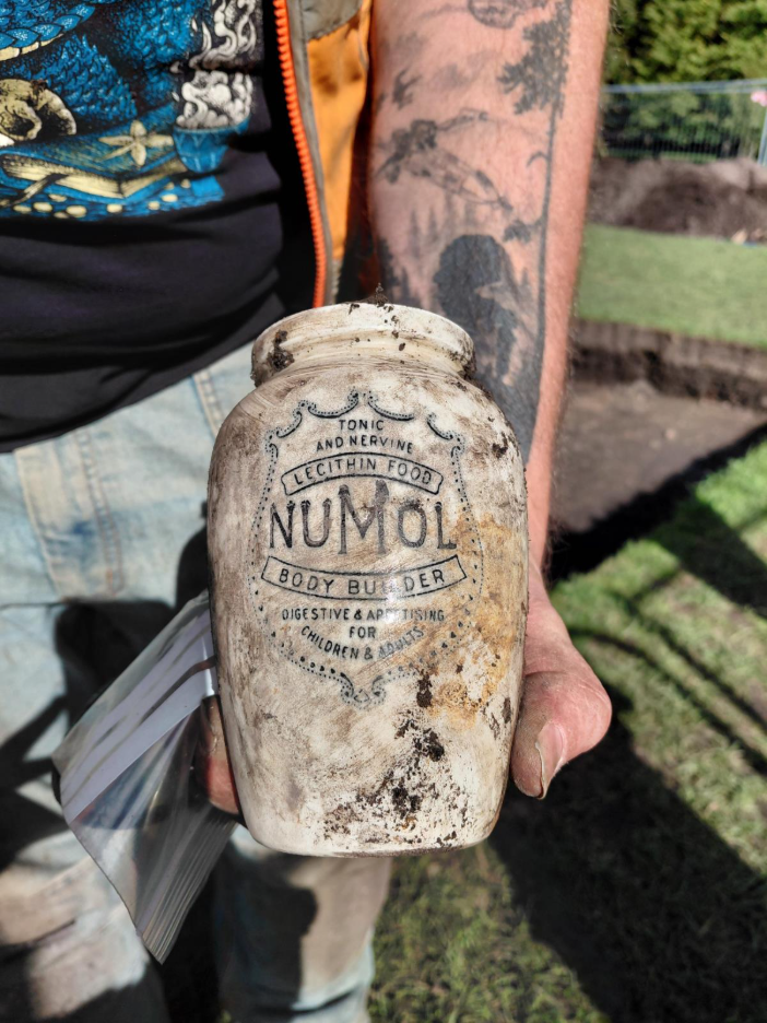 The mystery feature was uncovered late on Thursday while the team were cleaning back in order to find the edges of an older version of the path that once ran from Church Bank to the old Jarrow Village and, unable to leave a single stone unturned, we got to work excavating it today to try and figure out what on Earth is going on. We’re unsure if the feature was a drainage ditch for the path, or perhaps a service trench for old gas lit streetlights. Regardless, when we got to work we discovered that it was full to the brim with old cans, pots, pans, iron kettles, stones and one very distressing clown shaped eggcup. On top of all of that we think we might have found the terrifyingly huge remains of our very own monster: The Jarrow Wyrm!